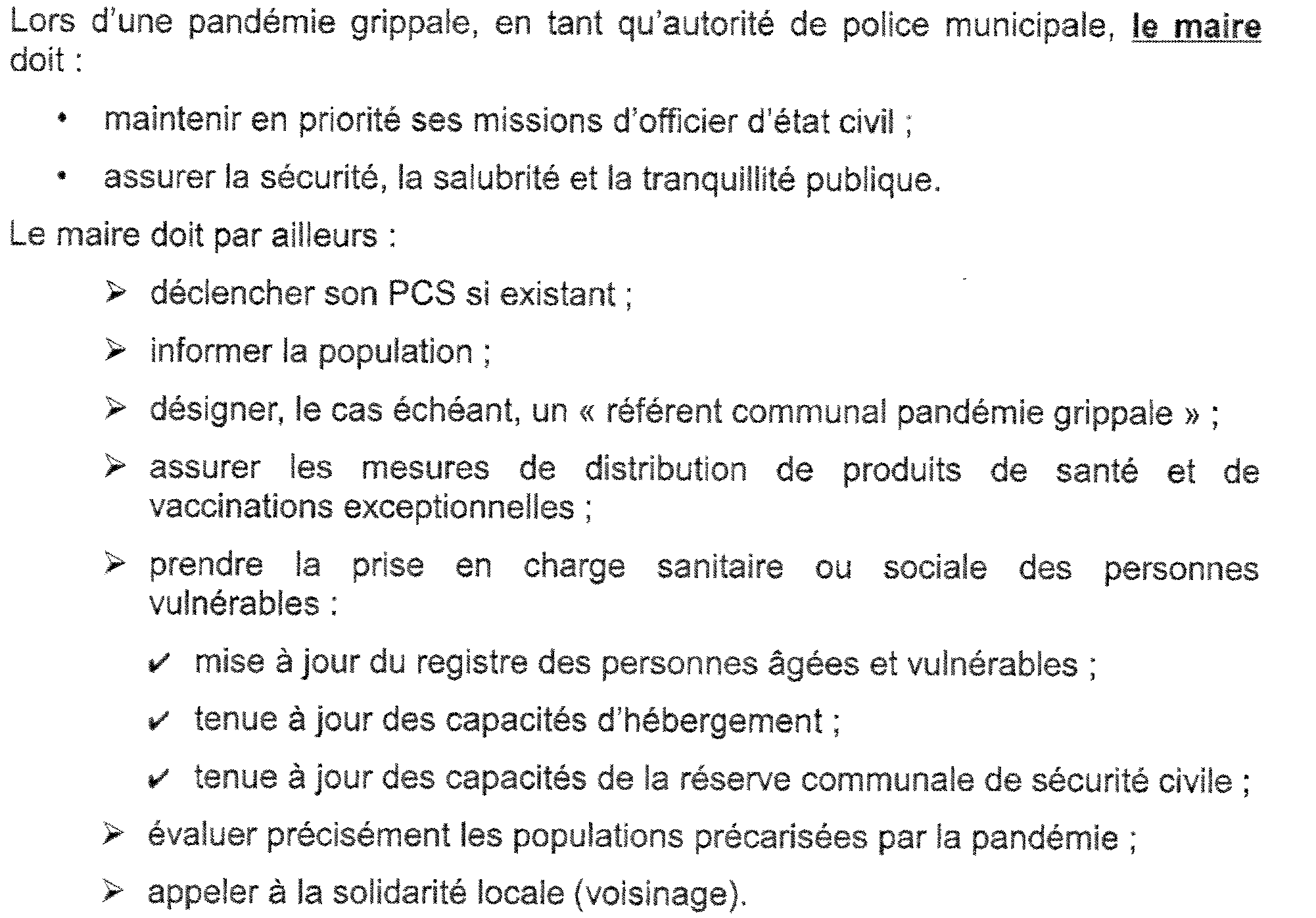 Actuellement le plan ORSEC REB est activé. C’est dans ce plan aussi appelé Plan ORSEC départemental Dispositifs Spécifiques Pandémie Grippale que le rôle de la commune est précisé.